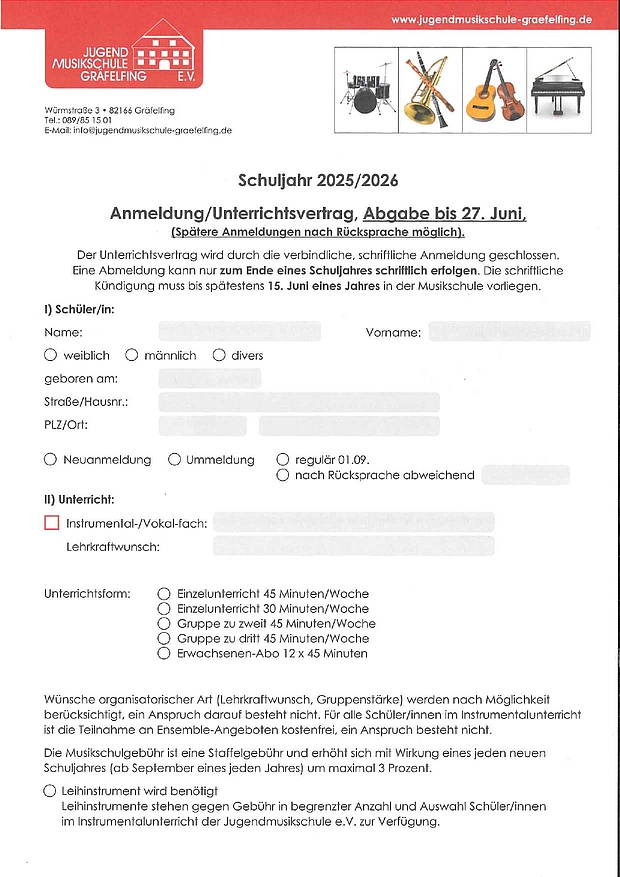 Mit der Zusendung des Anmeldeformulars stimme ich automatisch den Datenschutzbestimmungen und der dort angeführten Erhebung, Verarbeitung und Nutzung meiner Daten durch die Jugendmusikschule Gräfelfing e.V. zu.